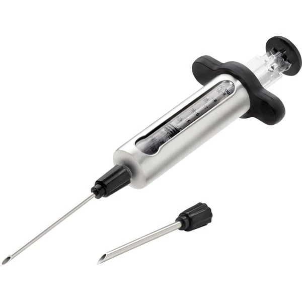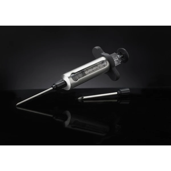 Mit dem Napoleon Marinaden-Injektor 55028 aus Edelstahl gelingt das Grillgut geschmackvoller und saftiger. Das Gehäuse ist aus hochwertigem Edelstahl gefertigt und verfügt über ein praktisches Sichtfenster. Unzen und Teelöffel werden als Einheit angeführt und ermöglichen eine rezeptgetreue Zubereitung. Je nach der verwendeten Flüssigkeit stehen zwei Injektionsnadeln zur Wahl: Die kleinere Nadel ist perfekt für dünnflüssige Saucen, zerronnene Butter, Wein und Marinaden geeignet. Die dickere Nadel ist perfekt für Marinaden mit Kleingehacktem, wie Knoblauch oder Kräutern, geeignet. Dank der Reinigungsbürste lässt sich der Marinaden-Injektor einfach und hygienisch säubern. In der ebenfalls enthaltenen Aufbewahrungsbox findet außerdem alles seinen rechten Platz.Art.-Nr.: 1404512
