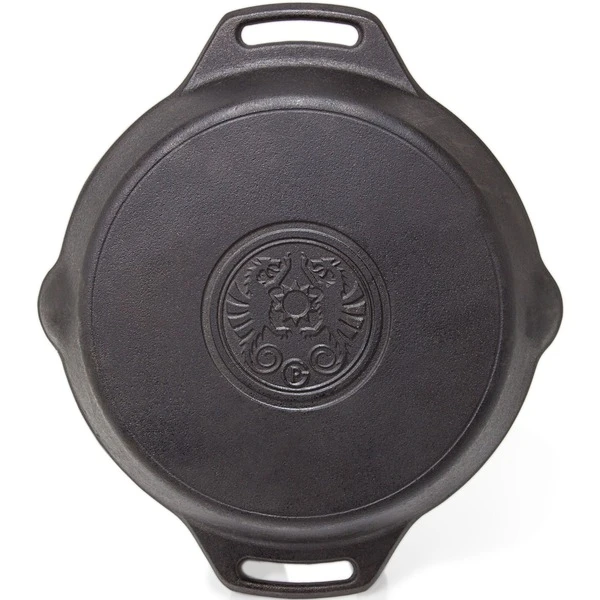 Die gusseiserne Petromax Feuerpfanne fp30h-t gehört mit ihrer exzellenten Wärmespeicherung zur Ausstattung jeder Küche. Ob in der Draußen-Küche über dem offenen Feuer gekocht wird oder auf dem Herd zuhause, man kann die Feuerpfanne sowohl auf herkömmlichen Herdplatten, auf Gasflammen, im Backofen als auch im Freien auf einer Kochstelle, über einem Lagerfeuer oder auf einem passenden Grill verwenden. Das Gusseisen mit seiner ausgezeichneten Wärmeverteilung und -speicherung ist dank der vorbehandelten Oberfläche (seasoned finish) sofort einsatzbereit und leicht zu pflegen.Art.-Nr.: 1532893