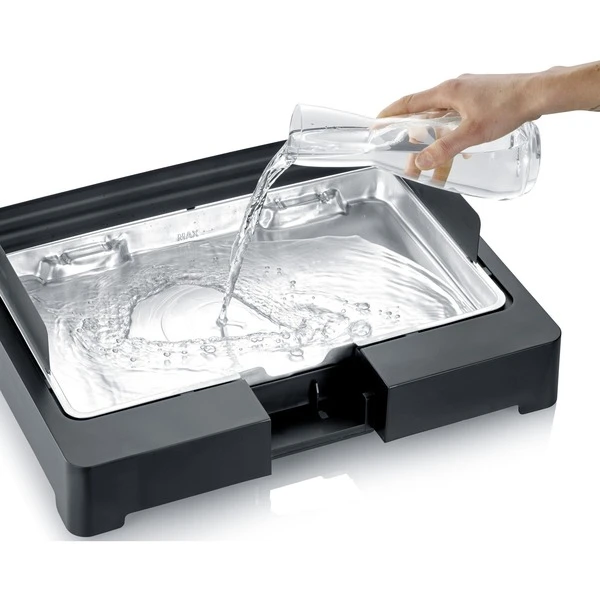 Der BBQ-Tischgrill 8562 von Severin ist flexibel einsetzbar, indoor und outdoor. Er verfügt über eine gerippte Grillplatte mit 44 x 26cm Grillfläche, der ein ansprechendes Grillmuster auf Steaks, Fisch, Würste und viele andere Gerichte zaubert. Auch Low-Fat-Grillen ist möglich, denn die Bratflüssigkeit tropft in eine Wasserschale ab. Das Wasser in der Reflektorschale sorgt außerdem für leichte Reinigung und verhindert Fettbrand und Rauchbildung. Die hohe Leistung und der 8cm hohe Windschutz bringen den Tischgrill schnell auf Temperatur, dabei kann die Temperatur stufenlos eingestellt werden, was für perfekte Grillergebnisse sorgt. Dank des SafeTouch-Gehäuses besteht keine Verbrennungsgefahr an den Oberflächen. Der BBQ-Tischgrill 8562 überzeugt durch schnelles und einfaches Zusammensetzen bzw. Auseinanderbauen und ist nicht nur rasch einsatzbereit, sondern auch leicht zu reinigen.Art.-Nr.: 1740660