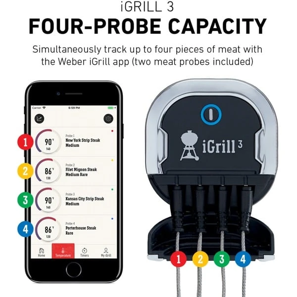 Dieses vielseitige und innovative Thermometer verbindet sich via Bluetooth mit der kostenlosen Weber iGrill-App und misst sowohl die Kern- als auch die Temperatur in der Grillkammer. Man hat die freie Wahl – voreingestellte Werte nutzen oder eigene Werte festlegen. Das Thermometer enthält 2 Messfühler und ist für bis zu vier Fühler geeignet. Neben der Bluetooth Verbindung zum Smartphone oder zum Tablet besteht nun auch die Möglichkeit des Social Networking. Innerhalb der iGrill-App haben Nutzer nun auch die Möglichkeit, ihre Grillerlebnisse z.B. durch das Veröffentlichen von Fotos zu teilen. Auch der eigene Standort kann markiert und auf einer Weltansicht angezeigt werden. Jedes iGrill Thermometer kann durch die Magnethalterung am Gehäuse bequem am Grill befestigt werden. Mit dem iGrill 3 ist es sogar möglich, die Beleuchtung am Genesis II LX aus der Ferne zu steuern. Außerdem ist das iGrill 3 Thermometer wetterbeständig und kann daher am Grill verbleiben.Art.-Nr.: 1303167